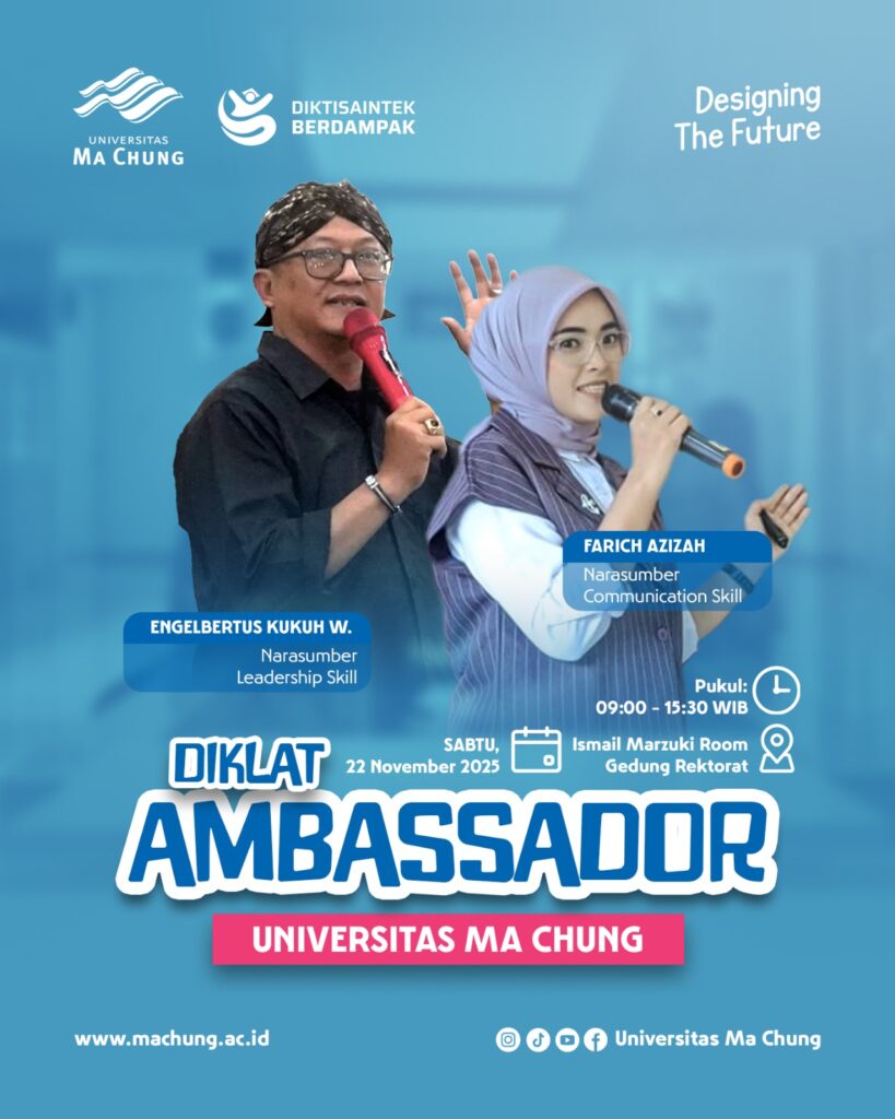 Diklat Ambassador Universitas Ma Chung hadir dengan pembekalan leadership dan communication skill bersama para narasumber ahli, demi mendukung para ambassador biar makin percaya diri dan siap tampil sebagai wajah Ma Chung yang inspiratif.