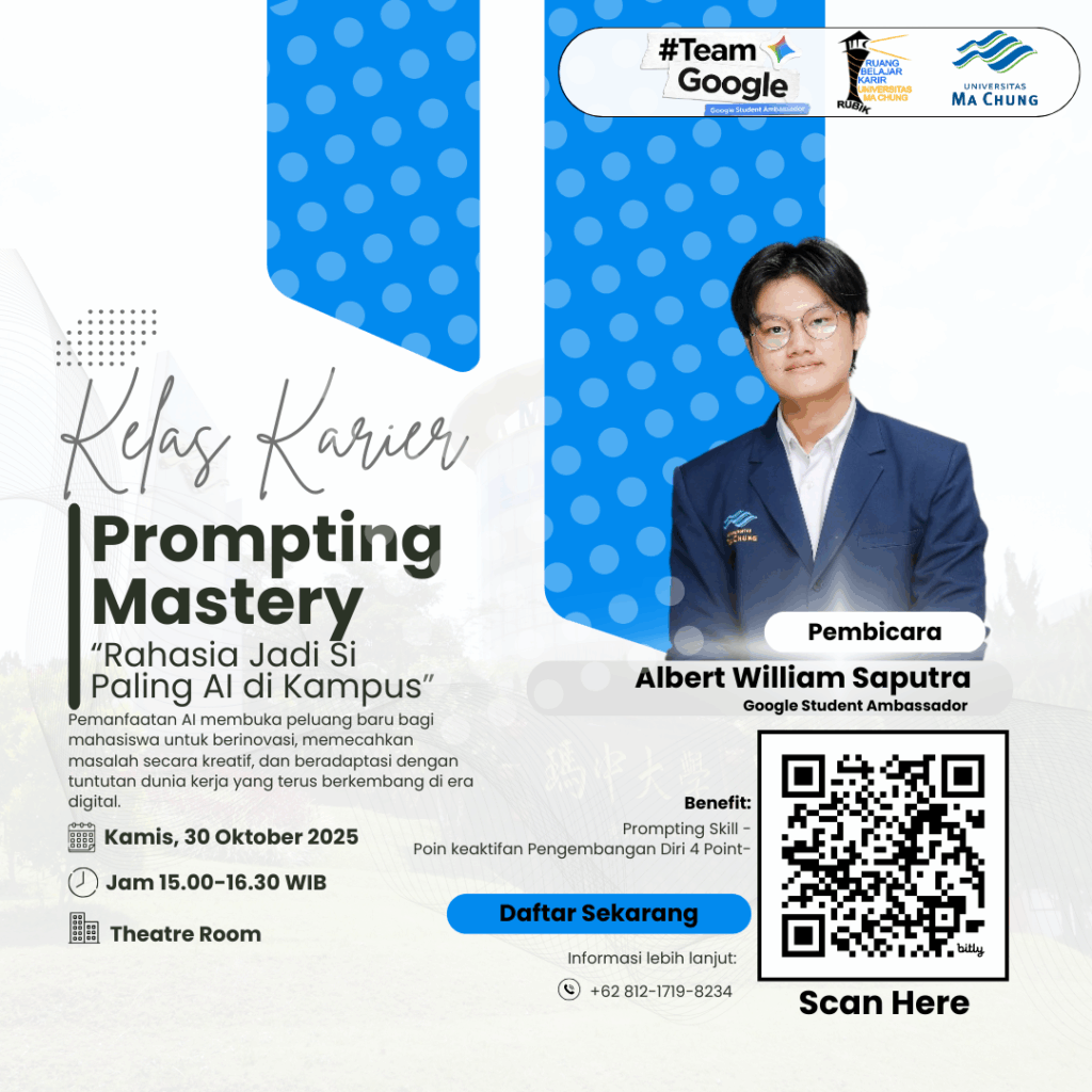 Bersama Albert William Saputra (Google Student Ambassador), Machungers akan belajar langsung strategi prompting AI yang bisa langsung diterapkan untuk ide proyek atau tugas kuliah.