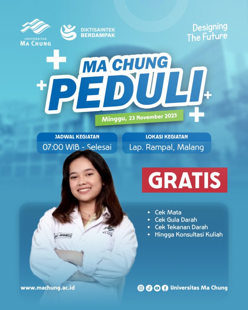 Universitas Ma Chung melalui program Ma Chung Peduli tetap berkomitmen dalam mendukung kesehatan masyarakat. Warga Malang dapat menikmati layanan cek mata, cek gula darah, tekanan darah, kolesterol, hingga konsultasi kuliah secara gratis, terbuka untuk semua. Catat tempat dan waktunya ya!