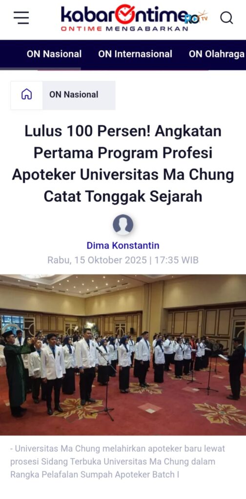 KABARONTIME.COM – Universitas Ma Chung melahirkan apoteker baru lewat prosesi Sidang Terbuka Universitas Ma Chung dalam Rangka Pelafalan Sumpah Apoteker Batch I, Rabu (15/10/2025)
