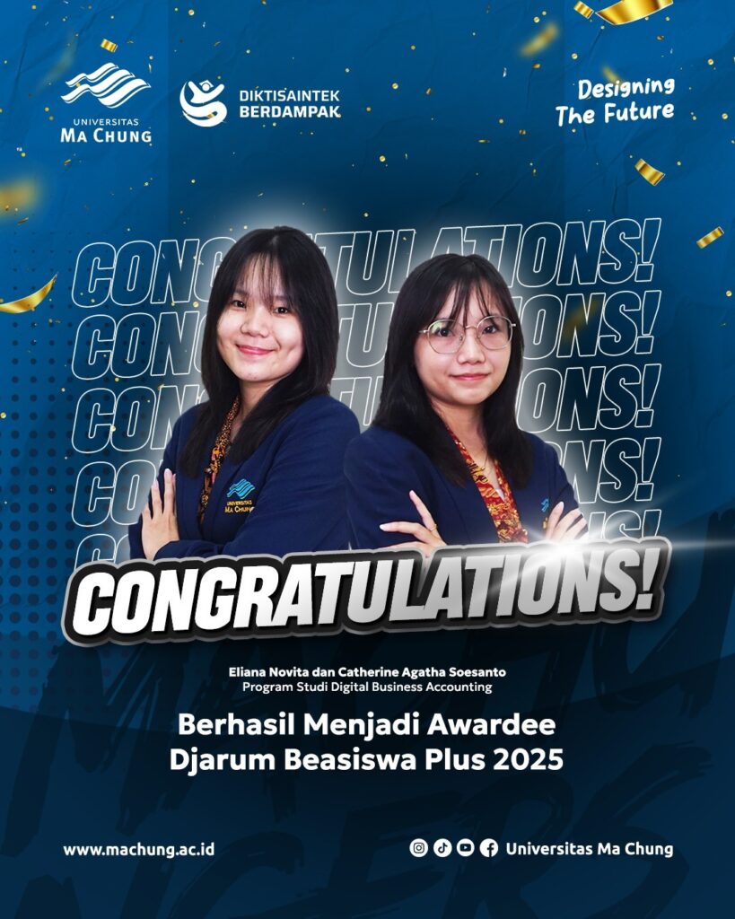 Dua mahasiswa dari Program Studi Digital Business Accounting Universitas Ma Chung, Eliana Novita dan Catherine Agatha, berhasil menorehkan prestasi membanggakan dengan terpilih sebagai awardee Djarum Beasiswa Plus 2025. Setelah melewati proses seleksi yang ketat, keduanya kini resmi menjadi awardee salah satu beasiswa paling bergengsi di Indonesia dan menyandang gelar Beswan Djarum.