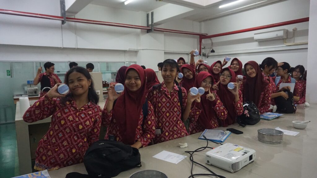 Siswa kemudian diajak untuk melakukan praktik membuat bedak Medicated Powder dalam kelompok yang terdiri atas tiga orang dengan menggunakan bahan segar dan alat-alat yang tersedia. Setelah itu, siswa-siswi diajak untuk berkeliling melihat Laboratorium Steril dan Laboratorium Mikrobiologi untuk memperkaya pengetahuan mereka.