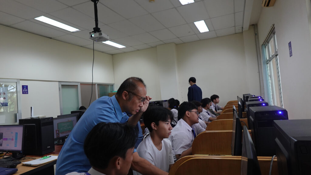 Selama kunjungan, para siswa mengikuti berbagai sesi pembelajaran sesuai tingkat kelas. Siswa kelas 7 mendapatkan materi coding dasar HTML dan CSS bersama Paulus Lucky Tirma Irawan, S.Kom., MT., dosen Program Studi Computer Science in Artificial Intelligence and Digital Innovation (Teknik Informatika).