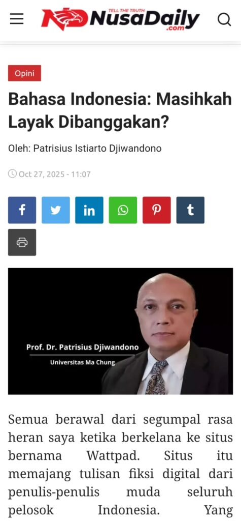 Patrisius Istiarto Djiwandono adalah guru besar bidang pendidikan bahasa di prodi English for Global and Creative Communication, Universitas Ma Chung, dan Ketua Dewan Pakar Perkumpulan Ilmuwan Sosial Humaniora Indonesia. Tulisan ini dibuat untuk menyambut Bulan Bahasa Nasional 2025.