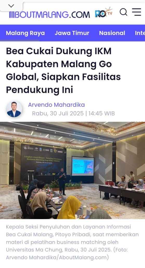 Dalam Pelatihan Persiapan Business Matching bertajuk “Langkah Awal Ekspor” yang digelar Universitas Ma Chung, Rabu, 30 Juli 2025 di Ijen Suites Hotel Kota Malang, Bea Cukai Malang turut menyampaikan dukungan nyata mereka bagi para pelaku usaha lokal.