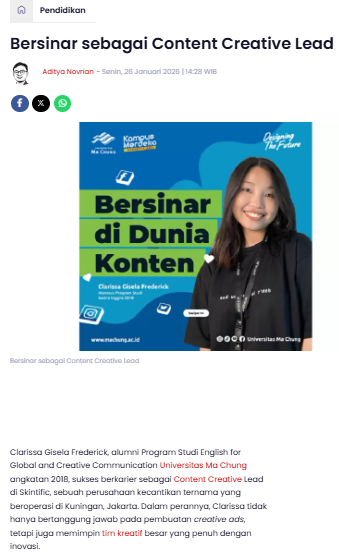 Clarissa Gisela Frederick, alumni Program Studi English for Global and Creative Communication Universitas Ma Chung angkatan 2018, sukses berkarier sebagai Content Creative Lead di Skintific, sebuah perusahaan kecantikan ternama yang beroperasi di Kuningan, Jakarta. Dalam perannya, Clarissa tidak hanya bertanggung jawab pada pembuatan creative ads, tetapi juga memimpin tim kreatif besar yang penuh dengan inovasi.