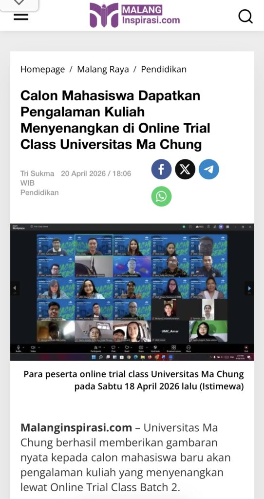 Malanginspirasi.com – Universitas Ma Chung berhasil memberikan gambaran nyata kepada calon mahasiswa baru akan pengalaman kuliah yang menyenangkan lewat Online Trial Class Batch 2.