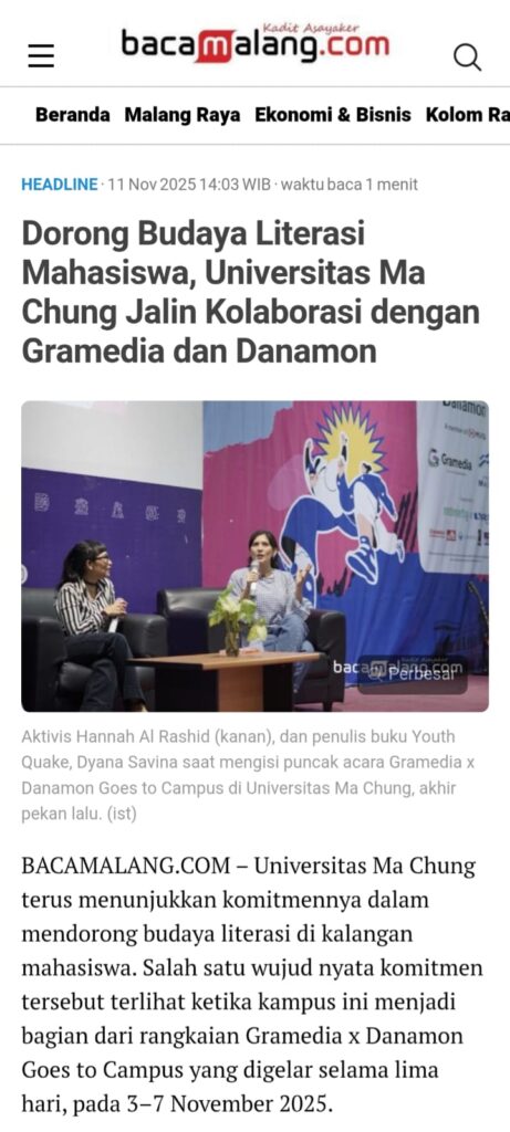 BACAMALANG.COM – Universitas Ma Chung terus melanjutkan komitmennya dalam mendorong budaya literasi di kalangan mahasiswa. Salah satu wujud nyata komitmen tersebut terlihat ketika kampus ini menjadi bagian dari rangkaian Gramedia x Danamon Goes to Campus yang digelar selama lima hari, pada 3-7 November 2025.