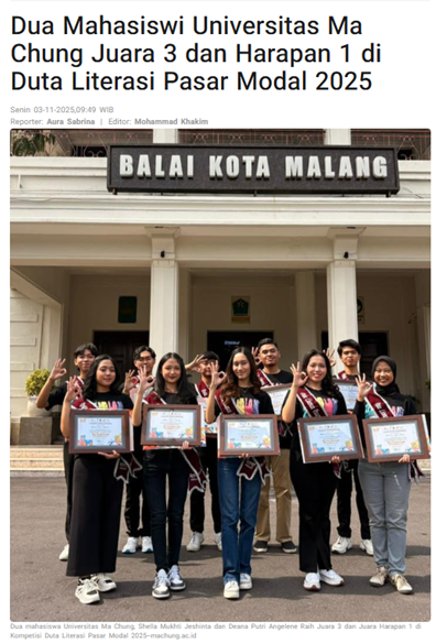 MALANG, DISWAYMALANG.ID–Dua mahasiswa Universitas Ma Chung, Shella Mukhti Jeshinta dari Program Studi (Prodi) International Business Management dan Deana Putri Angelene dari Prodi Digital Business Accounting, meraih Juara 3 dan Juara Harapan 1 dalam kompetisi Duta Literasi Pasar Modal 2025.