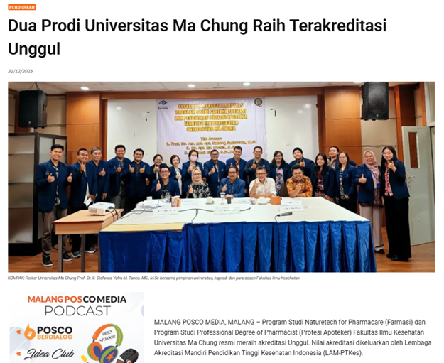 MALANG POSCO MEDIA, MALANG – Program Studi Naturetech for Pharmacare (Farmasi) dan Program Studi Professional Degree of Pharmacist (Profesi Apoteker) Fakultas Ilmu Kesehatan Universitas Ma Chung resmi meraih akreditasi Unggul. Nilai akreditasi dikeluarkan oleh Lembaga Akreditasi Mandiri Pendidikan Tinggi Kesehatan Indonesia (LAM-PTKes).