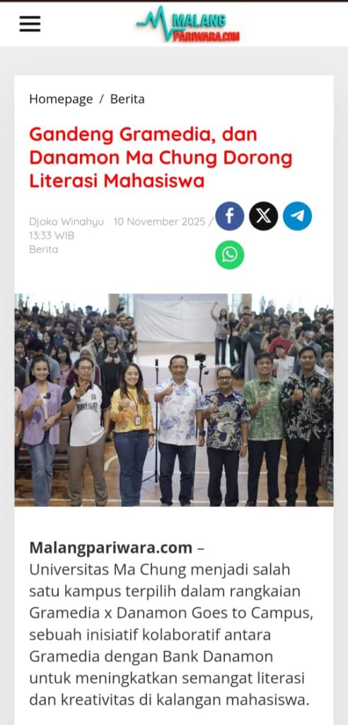 Universitas Ma Chung menjadi salah satu kampus terpilih dalam rangkaian Gramedia x Danamon Goes to Campus, sebuah inisiatif kolaboratif antara Gramedia dengan Bank Danamon untuk meningkatkan semangat literasi dan kreativitas di kalangan mahasiswa.