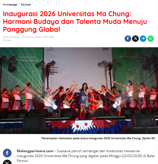 Malangpariwara.com – Suasana penuh semangat dan kreativitas mewarnai Inaugurasi 2026 Universitas Ma Chung yang digelar pada Minggu (22/02/2026) di Balai Pertiwi.