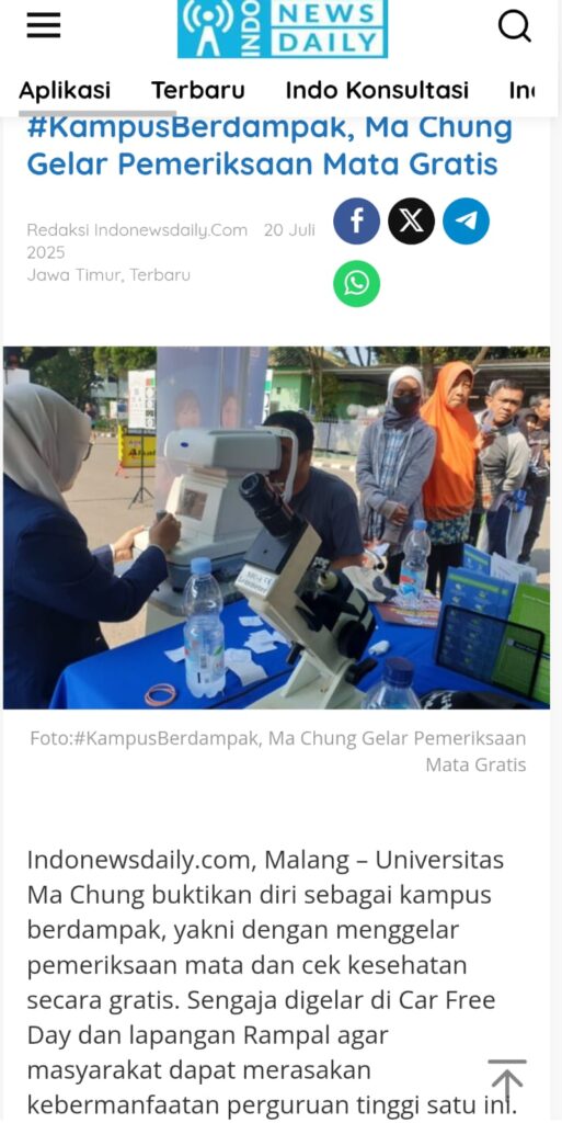 Indonewsdaily.com, Malang – Universitas Ma Chung buktikan diri sebagai kampus berdampak, yakni dengan menggelar pemeriksaan mata dan cek kesehatan secara gratis. Sengaja digelar di Car Free Day dan lapangan Rampal agar masyarakat dapat merasakan kebermanfaatan perguruan tinggi satu ini.