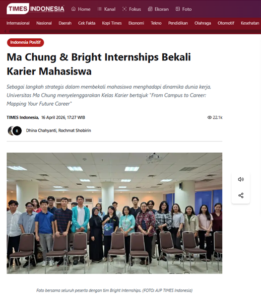 MALANG – Sebagai langkah strategis dalam membekali mahasiswa menghadapi dinamika dunia kerja, Universitas Ma Chung menyelenggarakan Kelas Karier bertajuk “From Campus to Career: Mapping Your Future Career” pada Kamis, 16 April 2026. Bertempat di Gedung R&D Lantai 6, acara ini berkolaborasi dengan Bright Internships dan menyasar seluruh mahasiswa aktif, khususnya angkatan 2024 dan 2025.