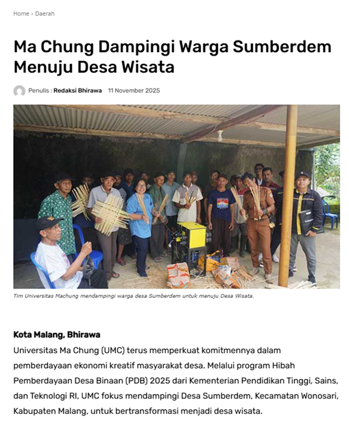 Universitas Ma Chung (UMC) terus memperkuat komitmennya dalam pemberdayaan ekonomi kreatif masyarakat desa. Melalui program Hibah Pemberdayaan Desa Binaan (PDB) 2025 dari Kementerian Pendidikan Tinggi, Sains, dan Teknologi RI, UMC fokus mendampingi Desa Sumberdem, Kecamatan Wonosari, Kabupaten Malang, untuk bertransformasi menjadi desa wisata.