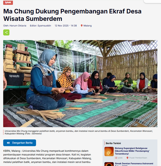 KBRN, Malang : Universitas Ma Chung memperkuat komitmennya dalam pemberdayaan masyarakat melalui program desa binaan. Kali ini, kegiatan difokuskan di Desa Sumberdem, Kecamatan Wonosari, Kabupaten Malang, melalui pelatihan batik, anyaman bambu, dan instalasi mesin serut bambu.