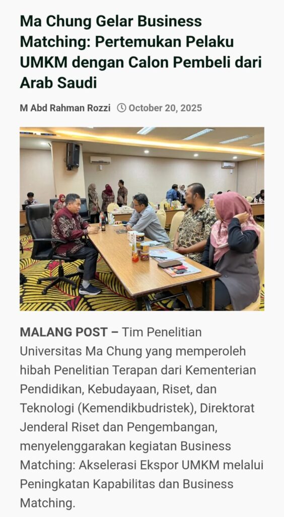 MALANG POST – Tim Penelitian Universitas Ma Chung yang memperoleh hibah Penelitian Terapan dari Kementerian Pendidikan, Kebudayaan, Riset, dan Teknologi (Kemendikbudristek), Direktorat Jenderal Riset dan Pengembangan, menyelenggarakan kegiatan Business Matching: Akselerasi Ekspor UMKM melalui Peningkatan Kapabilitas dan Business Matching.