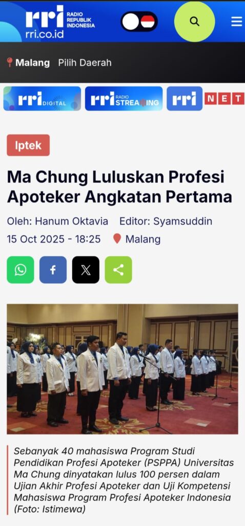 KBRN, Malang : Sebanyak 40 mahasiswa Program Studi Pendidikan Profesi Apoteker (PSPPA) Universitas Ma Chung dinyatakan lulus 100 persen dalam Ujian Akhir Profesi Apoteker dan Uji Kompetensi Mahasiswa Program Profesi Apoteker Indonesia (UKMPPAI). Capaian tersebut diumumkan dalam Sidang Terbuka Pelafalan Sumpah Apoteker Batch I yang digelar pada Rabu (15/10/2025).