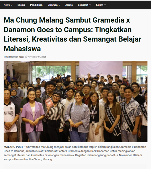 MALANG POST – Universitas Ma Chung menjadi salah satu kampus terpilih dalam rangkaian Gramedia x Danamon Goes to Campus, sebuah inisiatif kolaboratif antara Gramedia dengan Bank Danamon untuk meningkatkan semangat literasi dan kreativitas di kalangan mahasiswa. Kegiatan ini berlangsung pada 3–7 November 2025 di kampus Universitas Ma Chung, Malang.