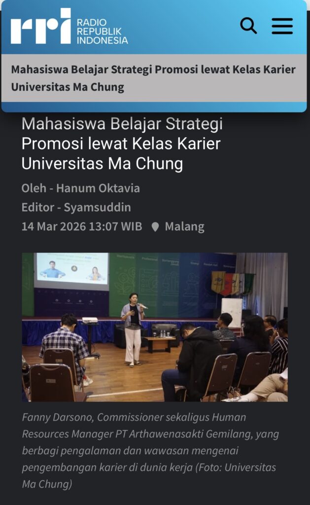 RRI.CO.ID, Malang – Memasuki dunia kerja tidak hanya membutuhkan kemampuan akademik, tetapi juga pemahaman mengenai pengembangan diri dan strategi membangun karier. Untuk memberikan bekal tersebut kepada mahasiswa, Universitas Ma Chung menggelar kegiatan Kelas Karier bertajuk “The Talent Lab: Menguak Misteri di Balik Jenjang Promosi” di Balai Pertiwi Universitas Ma Chung, Kamis (12/3/2026).