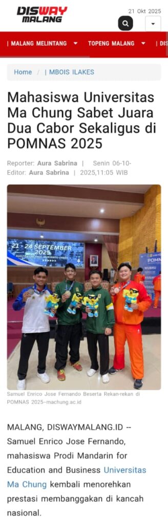 MALANG, DISWAYMALANG.ID — Samuel Enrico Jose Fernando, mahasiswa Prodi Mandarin for Education and Business Universitas Ma Chung kembali menorehkan prestasi membanggakan di kancah nasional.