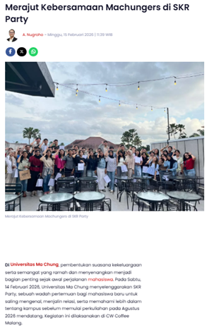 Di Universitas Ma Chung, pembentukan suasana kekeluargaan serta semangat yang ramah dan menyenangkan menjadi bagian penting sejak awal perjalanan mahasiswa. Pada Sabtu, 14 Februari 2026, Universitas Ma Chung menyelenggarakan SKR Party, sebuah wadah pertemuan bagi mahasiswa baru untuk saling mengenal, menjalin relasi, serta memahami lebih dalam tentang kampus sebelum memulai perkuliahan pada Agustus 2026 mendatang. Kegiatan ini dilaksanakan di CW Coffee Malang.