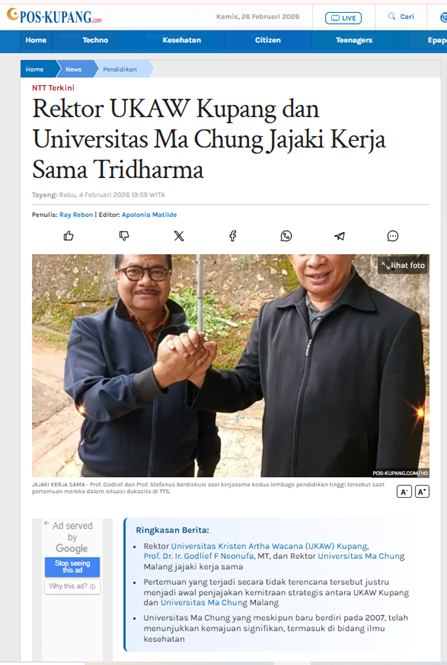 Dalam keterangan tertulis yang diterima, Rabu 4 Februari 2026, pertemuan yang terjadi secara tidak terencana tersebut justru menjadi awal penjajakan kemitraan strategis antara UKAW Kupang dan Universitas Ma Chung Malang, khususnya dalam penguatan Tridharma Perguruan Tinggi yang meliputi pendidikan, penelitian, dan pengabdian kepada masyarakat.