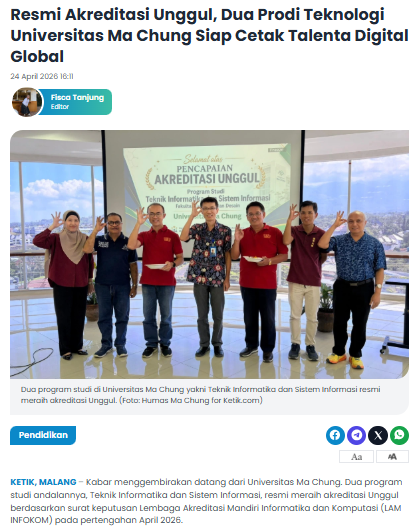 Dengan raihan akreditasi unggul ini, Universitas Ma Chung semakin menegaskan komitmennya dalam mencetak talenta digital berkualitas, sekaligus memperkuat posisinya sebagai pilihan utama bagi calon mahasiswa yang ingin berkarier di bidang teknologi informasi dan sistem manajemen. (*)