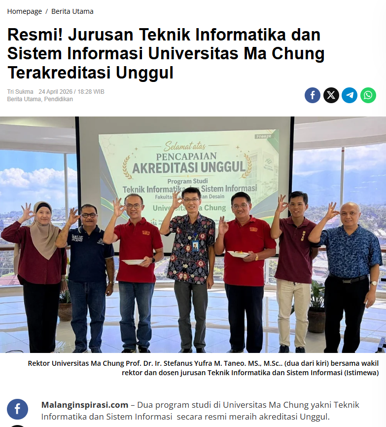 Lewat akreditasi unggul ini, Universitas Ma Chung semakin mantap melangkah untuk terus mencetak talenta-talenta digital yang siap menghadapi tantangan di masa depan.