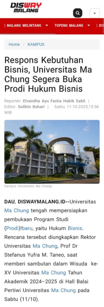 DAU, DISWAYMALANG.ID–Universitas Ma Chung tengah mempersiapkan pembukaan Program Studi (Prodi)!baru, yaitu Hukum Bisnis. Rencana tersebut diungkapkan Rektor Universitas Ma Chung, Prof Dr Stefanus Yufra M. Taneo, saat memberi sambutan dalam Wisuda ke-XV Universitas Ma Chung Tahun Akademik 2024–2025 di Hall Balai Pertiwi Universitas Ma Chung pada Sabtu (11/10).