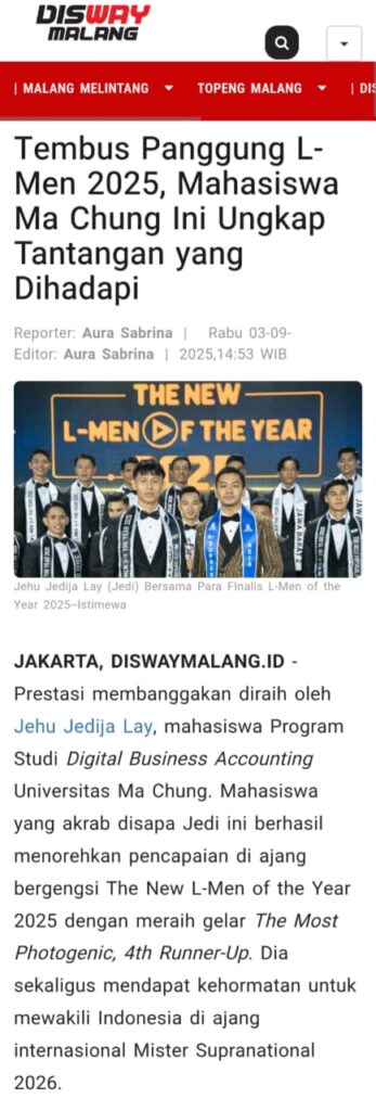 JAKARTA, DISWAYMALANG.ID – Prestasi membanggakan diraih oleh Jehu Jedija Lay, mahasiswa Program Studi Digital Business Accounting Universitas Ma Chung. Mahasiswa yang akrab disapa Jedi ini berhasil menorehkan pencapaian di ajang bergengsi The New L-Men of the Year 2025 dengan meraih gelar The Most Photogenic, 4th Runner-Up. Dia sekaligus mendapat kehormatan untuk mewakili Indonesia di ajang internasional Mister Supranational 2026.