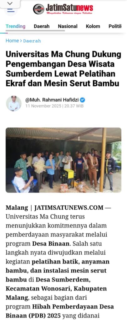 Malang | JATIMSATUNEWS.COM — Universitas Ma Chung terus menunjukkan komitmennya dalam pemberdayaan masyarakat melalui program Desa Binaan. Salah satu langkah nyata diwujudkan melalui kegiatan pelatihan batik, anyaman bambu, dan instalasi mesin serut bambu di Desa Sumberdem, Kecamatan Wonosari, Kabupaten Malang, sebagai bagian dari program Hibah Pemberdayaan Desa Binaan (PDB) 2025 yang didanai oleh Kementerian Pendidikan Tinggi, Sains, dan Teknologi Republik Indonesia.