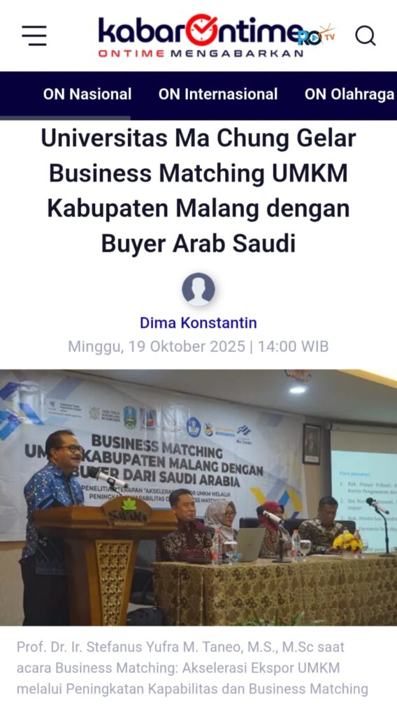 KABARONTIME.COM – Tim Penelitian Universitas Ma Chung yang dapatkan hibah Penelitian Terapan dari Kementerian Pendidikan Tinggi, Sains, dan Teknologi (Kemendiktisaintek), Direktorat Jenderal Riset dan Pengembangan gelar Business Matching: Akselerasi Ekspor UMKM melalui Peningkatan Kapabilitas dan Business Matching.
