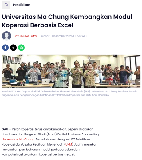 DAU – Peran koperasi terus dimaksimalkan. Seperti dilakukan tim dosen dari Program Studi (Prodi) Digital Business Accounting Universitas Ma Chung. Berkolaborasi dengan UPT Pelatihan Koperasi dan Usaha Kecil dan Menengah (UKM) Jatim, mereka melakukan pembahasan modul perkoperasian dan komputerisasi akuntansi koperasi berbasis excel.