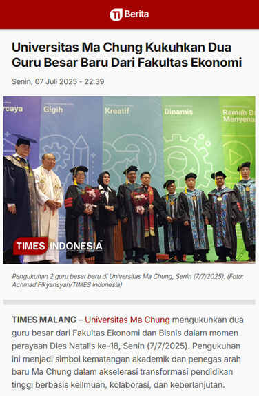“Kehadiran dua Guru Besar baru ini tidak hanya memperkaya khasanah keilmuan di lingkungan kampus, tetapi juga memperkuat reputasi Universitas Ma Chung sebagai institusi yang siap bersaing secara global,” ujarnya.