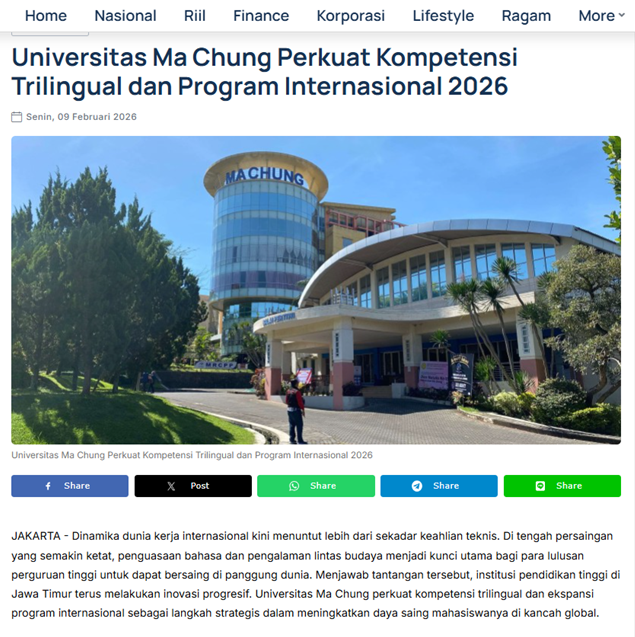 JAKARTA – Dinamika dunia kerja internasional kini menuntut lebih dari sekadar keahlian teknis. Di tengah persaingan yang semakin ketat, penguasaan bahasa dan pengalaman lintas budaya menjadi kunci utama bagi para lulusan perguruan tinggi untuk dapat bersaing di panggung dunia. Menjawab tantangan tersebut, institusi pendidikan tinggi di Jawa Timur terus melakukan inovasi progresif. Universitas Ma Chung perkuat kompetensi trilingual dan ekspansi program internasional sebagai langkah strategis dalam meningkatkan daya saing mahasiswanya di kancah global.