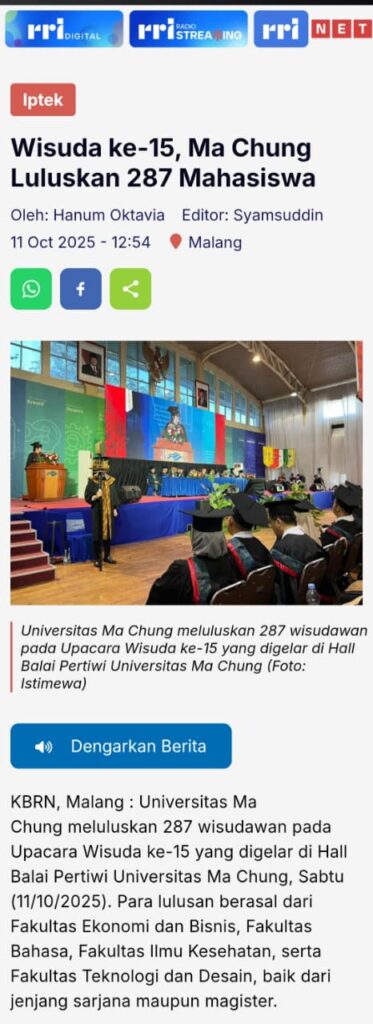 KBRN, Malang : Universitas Ma Chung meluluskan 287 wisudawan pada Upacara Wisuda ke-15 yang digelar di Hall Balai Pertiwi Universitas Ma Chung, Sabtu (11/10/2025). Para lulusan berasal dari Fakultas Ekonomi dan Bisnis, Fakultas Bahasa, Fakultas Ilmu Kesehatan, serta Fakultas Teknologi dan Desain, baik dari jenjang sarjana maupun magister.
