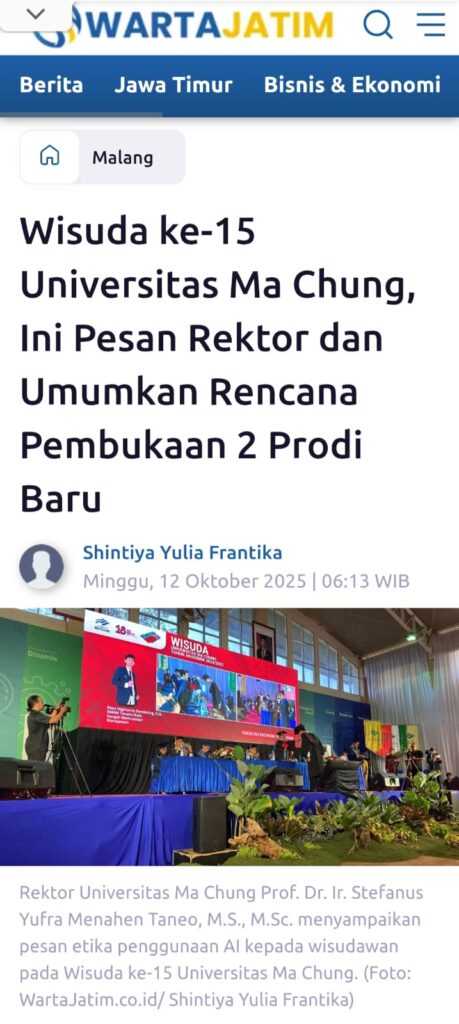 WartaJatim.CO.ID – Universitas Ma Chung kembali mencatat sejarah penting dalam dunia pendidikan tinggi dengan melahirkan 287 lulusan dalam Wisuda ke-15 yang digelar pada Sabtu, 11 Oktober 2025 di Hall Balai Pertiwi, Universitas Ma Chung.