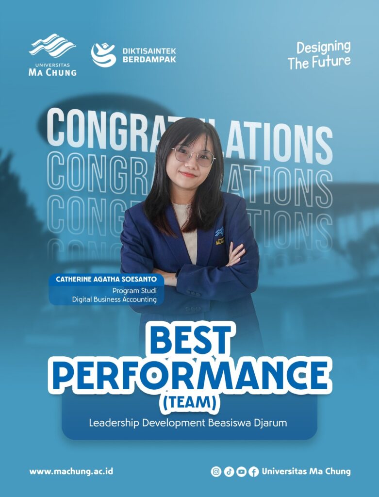 Universitas Ma Chung patut berbangga hati karena salah satu mahasiswinya, Catherine Agatha Soesanto dari program studi Digital Business Accounting, berhasil menunjukkan kapasitas kepemimpinannya dengan meraih penghargaan Best Performance (Team) dalam ajang Leadership Development yang diselenggarakan oleh Djarum Beasiswa Plus pada 25–28 Januari 2026.