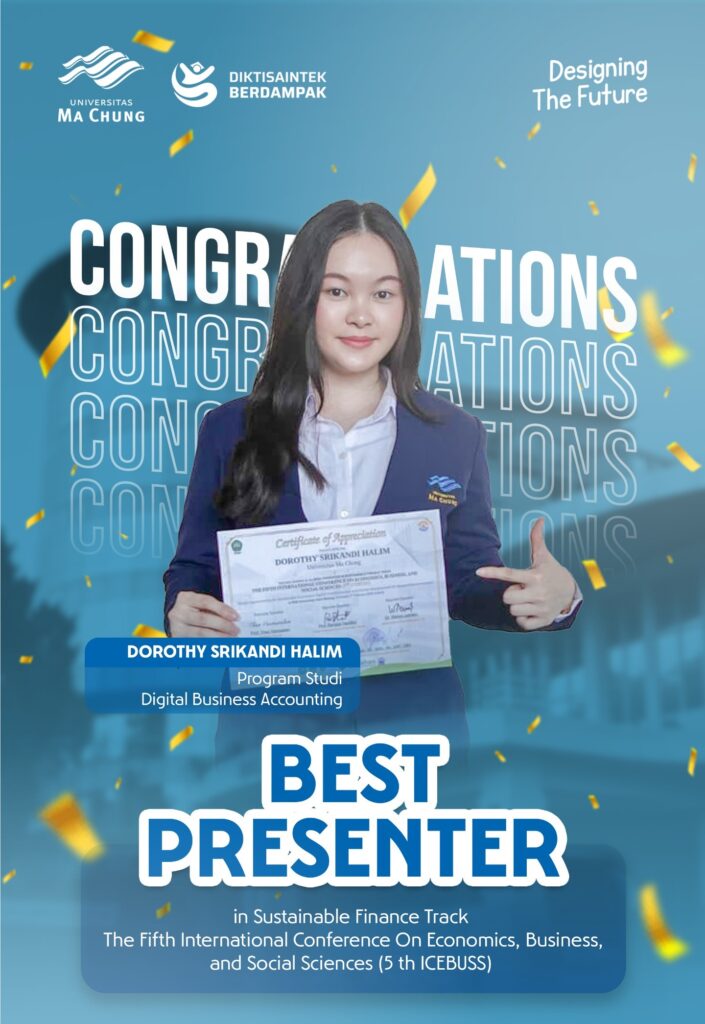 Fakultas Ekonomi dan Bisnis (FEB) Universitas Ma Chung kembali menorehkan prestasi membanggakan. Tidak hanya di tingkat lokal dan regional, tetapi juga di level internasional. Dua mahasiswa FEB, Dorothy Srikandi Halim dan Genoveva Mari, sukses mengharumkan nama kampus dengan meraih penghargaan Best Presenter dalam ajang The Fifth International Conference on Economics, Business and Social Sciences (5th ICEBUSS) yang diselenggarakan oleh Universitas Islam Malang pada 4 Februari 2026.
